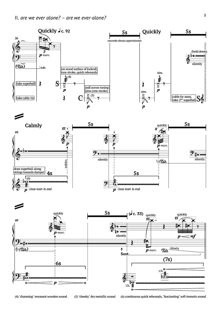 Der Klangraum des Klaviers wird erweitert durch Spieltechniken im Innenraum, durch Spiel auf präparierten Saiten, mit Filz, Gummischlägeln und Kabelbindern, auf Korpus und Stimmzapfen. Durch das Zusammenwirken zweier Spieler können aus diesen besonderen Spielarten einzigartige Klangwelten entstehen. Dabei wurden die Parts so angelegt, dass sie ohne größere technische Hürden relativ einfach spielbar sind, wodurch die Aufmerksamkeit sich der musikalischen Entwicklung und dem Zusammenspiel zuwenden kann.