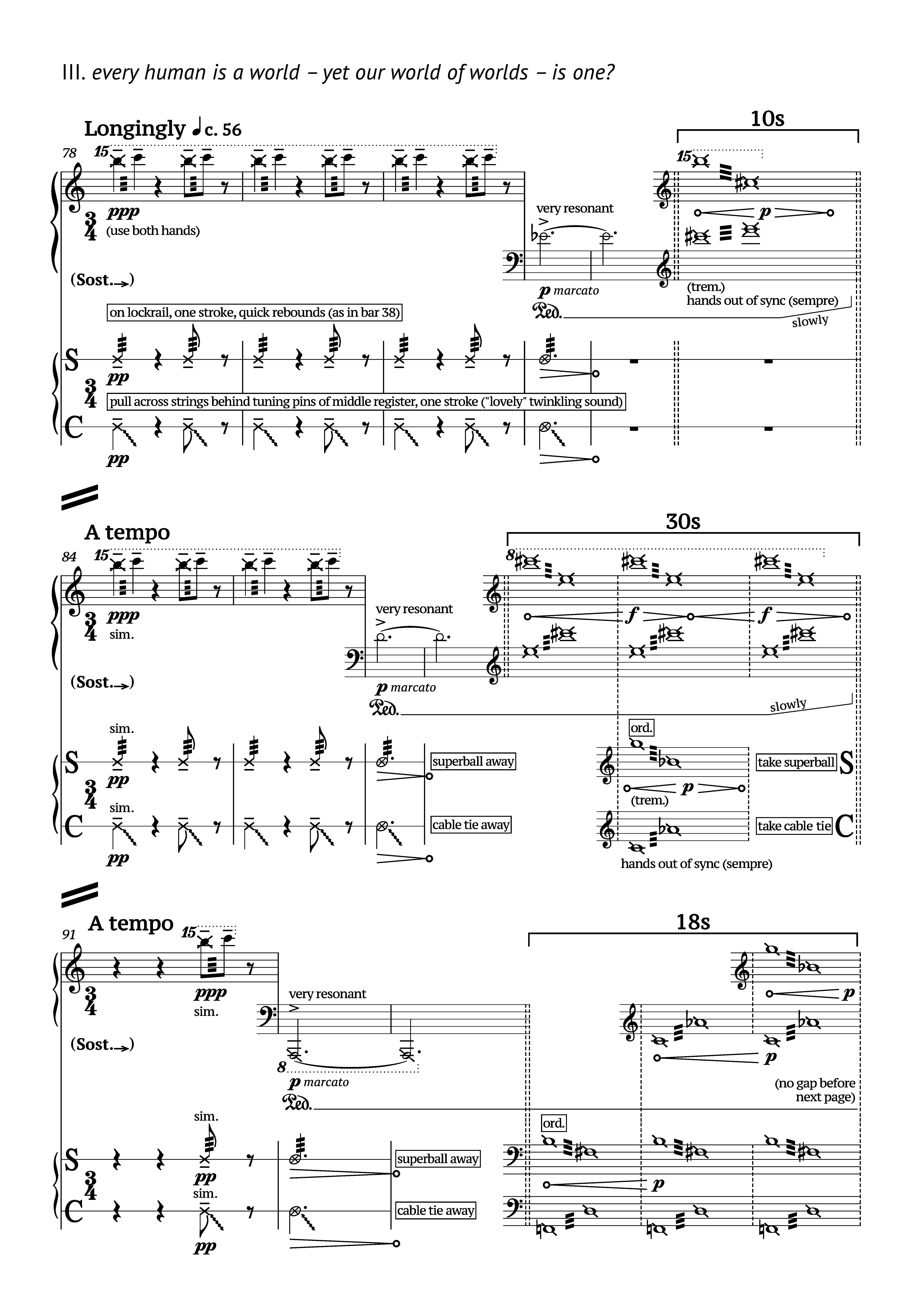 Der Klangraum des Klaviers wird erweitert durch Spieltechniken im Innenraum, durch Spiel auf präparierten Saiten, mit Filz, Gummischlägeln und Kabelbindern, auf Korpus und Stimmzapfen. Durch das Zusammenwirken zweier Spieler können aus diesen besonderen Spielarten einzigartige Klangwelten entstehen. Dabei wurden die Parts so angelegt, dass sie ohne größere technische Hürden relativ einfach spielbar sind, wodurch die Aufmerksamkeit sich der musikalischen Entwicklung und dem Zusammenspiel zuwenden kann.