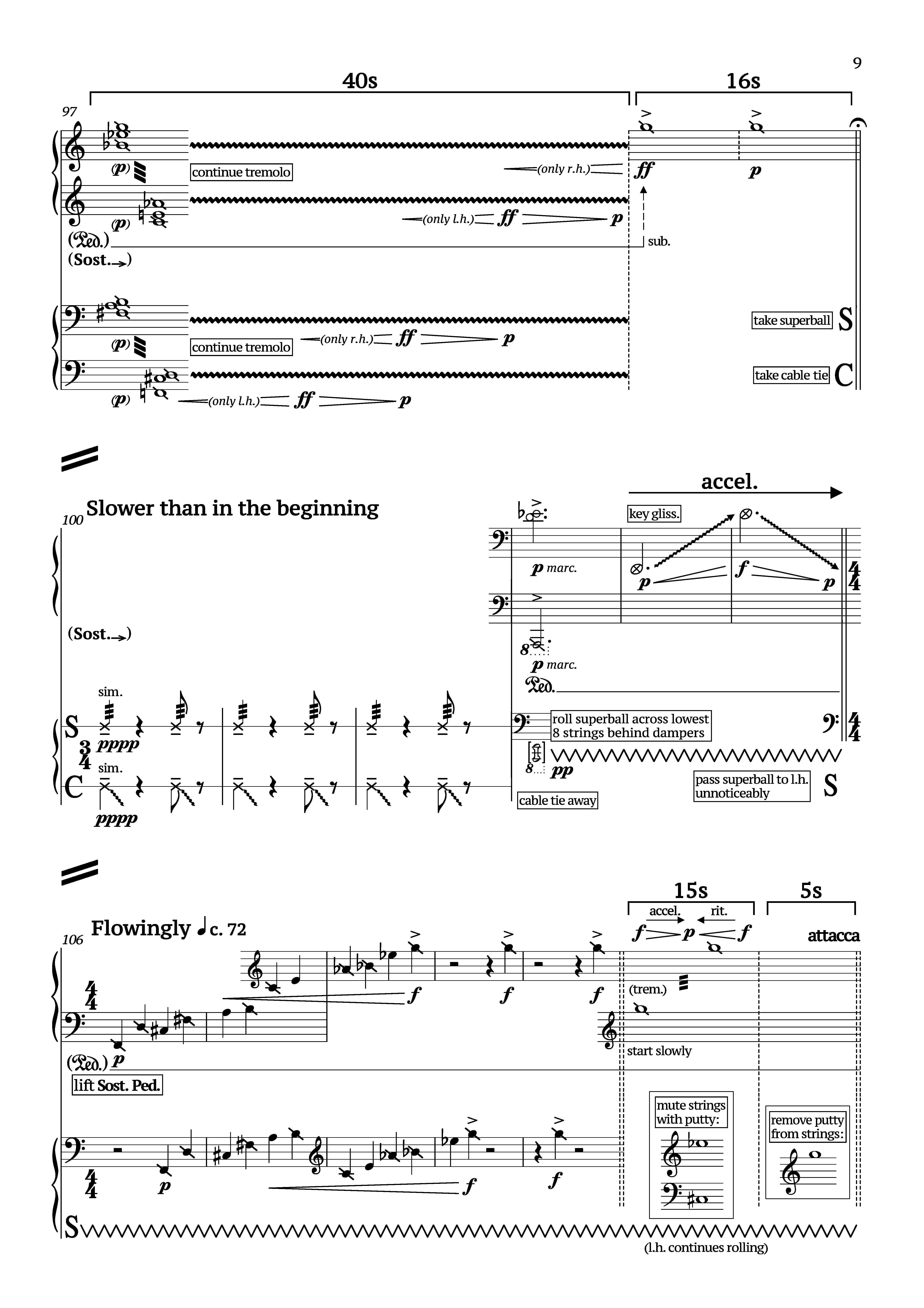 Benötigt werden: ein Flügel (empfohlen: Steinway D oder Steinway B), zwei Packungen Klebeknete (z.B. Patafix), zwei Superball-Mallets, zwei Filzflecken, ein kleiner Kabelbinder und ein kleiner Holzstab.
